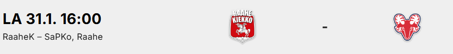 Tervetuloa seuraamaan Raahe-Kiekko vastaan Savonlinnan Pallokerho (SapKo) peliä Raahen jäähalliin lauantaina 31.1. Peli alkaa klo 16 ja käydään ennen sitä porukalla syömässä Pizzeria Manussa klo 14 alkaen, avecit ovat tervetulleita mukaan. Raahen Alueen Insinöörit ry tarjoaa ruuat ja lipun ottelutapahtumaan jäsenilleen, avecin omakustannehinta on 20€. Lippuja on reilu, mutta rajallinen määrä!